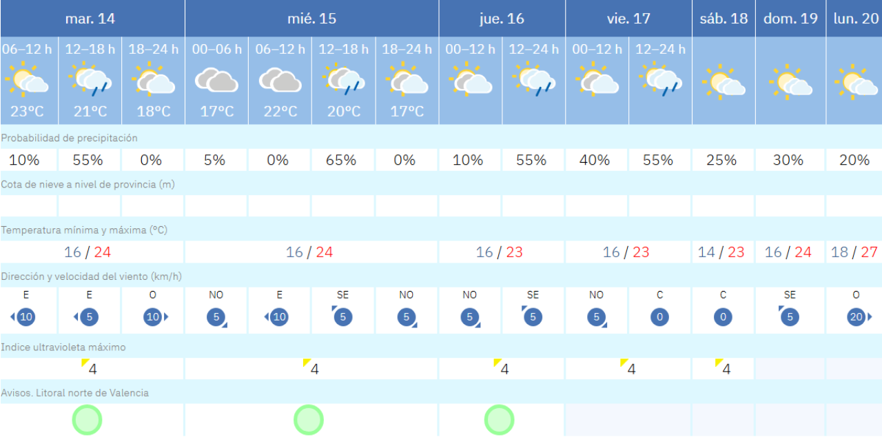 Aemet preveía para este martes un cielo nuboso de madrugada, con tendencia a intervalos despejados durante la mañana y nubosidad de evolución por la tarde. Las temperaturas mínimas experimentarán un ligero descenso, mientras que las máximas subirán de forma moderada. El viento, de componente norte en el litoral, soplará flojo o moderado, con posibles rachas más intensas en zonas de costa.