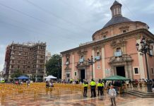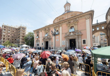 Las altas temperaturas y el cielo despejado de la jornada han dejado muchas imágenes de devotos con paraguas para resguardarse del sol en la plaza de la Virgen. / AVAN