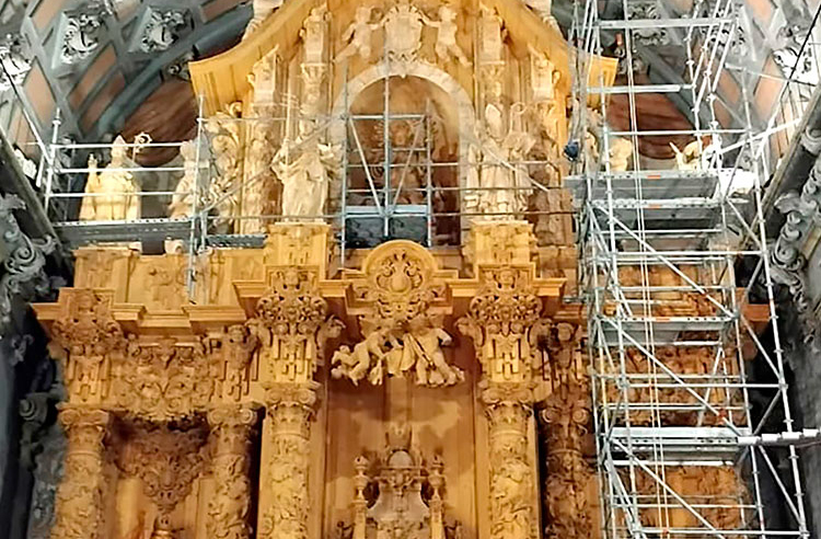 El retablo es una reconstrucción del original de estilo barroco y está labrado en madera de abeto y de pino rojo de Suecia, y alberga en el centro una imagen de la Virgen de los Ángeles, titular de la parroquia, y en los laterales dos imágenes de seis metros, de Aarón y otra de Melquisedec, “por ser referencia eucarística. En las portaladas de bajo están los relieves de San Pedro y San Pablo, columnas de la Iglesia, y en la parte superior, se pueden ver a los cuatro doctores de la Iglesia de occidente; San Jerónimo; San Agustín; San Ambrosio; y San Gregorio Magno, y la imagen de Nuestra Señora de los Ángeles, culminado con una referencia a la Santísima Trinidad”, indica el párroco.