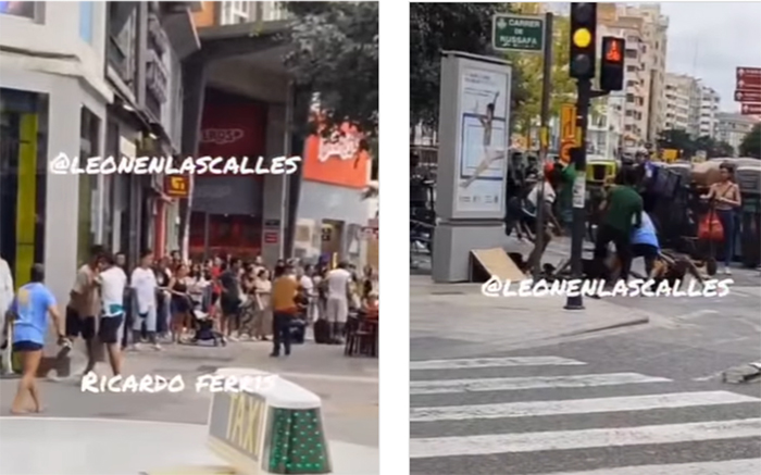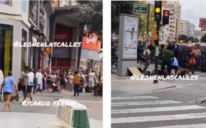Vídeo de la brutal pelea en la calle Xàtiva. Alrededor de 10 jóvenes se han liado a patadas y puñetazos entre el pasaje Doctor Serra y la calle Ruzafa. Los numerosos viandantes de la céntrica calle miran sorprendidos lo que está ocurriendo. Todos los implicados tienen entre 21 y 26 años.
