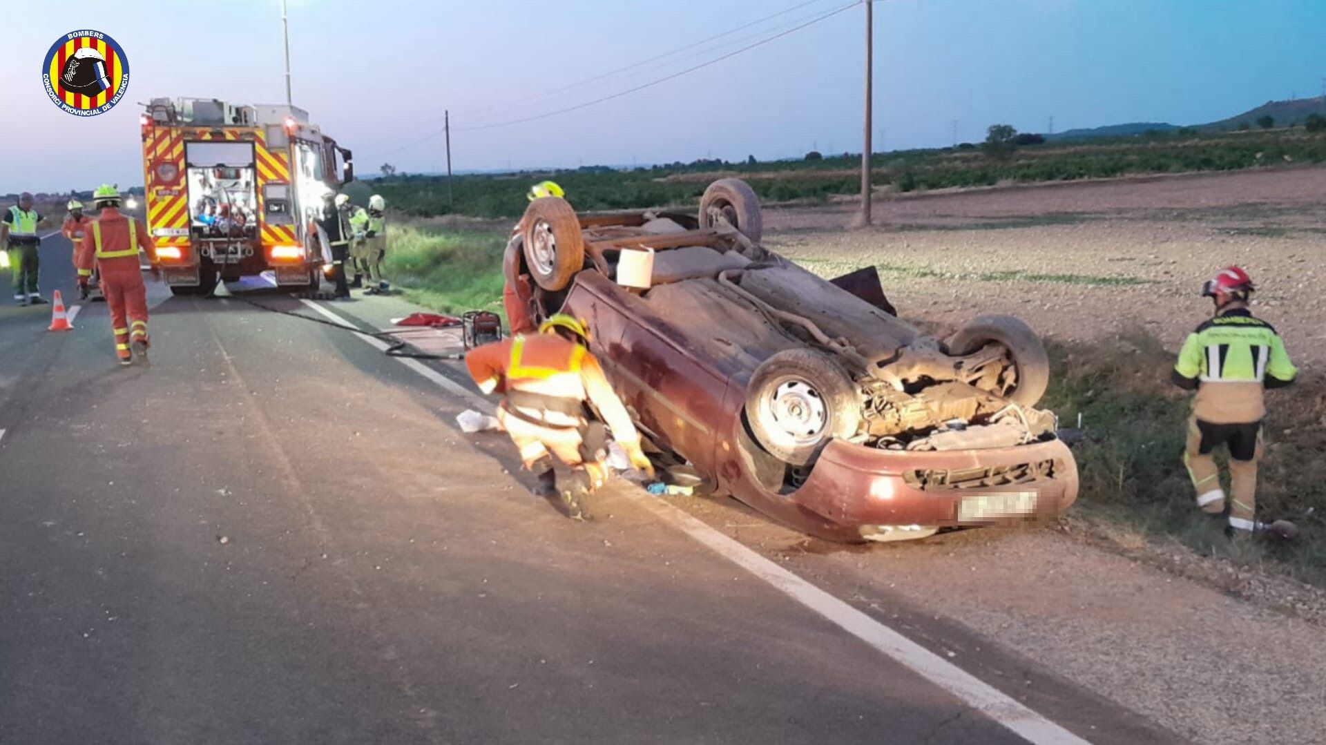 Vuelca un coche en Ayora y deja al conductor atrapado en su interior, el accidente ha tenido lugar el lunes por la noche, según informa el Consorcio Provincial de Bomberos. El suceso fue en la carretera de Almansa, el vehículo se salió de la vía y como puede verse en la imagen dio la vuelta al coche. Durante la operación, la carretera quedó parcialmente cortada mientras los equipos de emergencia aseguraban la zona y realizaban las tareas de rescate.