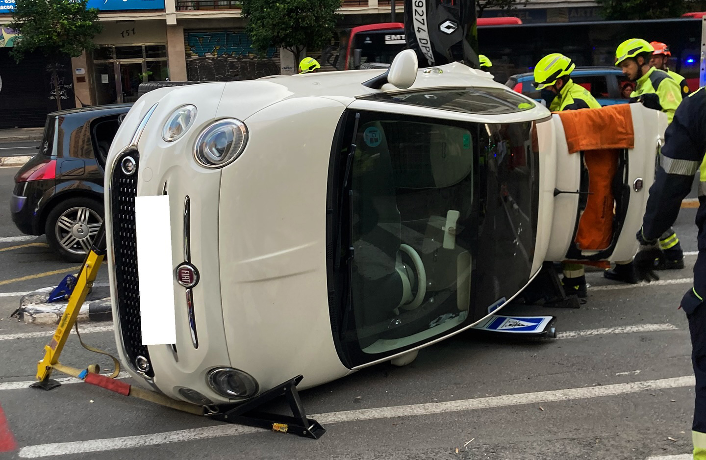 Vuelca un coche tras un accidente en la Avenida Primado Reig. Los bomberos localizan a su llegada a dos vehículos implicados en el choque. Uno de ellos volcado sobre un lateral con una persona en su interior que no podía salir por sus propios medios.